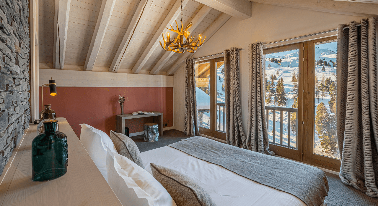 Our luxury chalet Juliette, designed for 14 people, has 7 en-suite bedrooms, a fully equipped kitchen, a magnificent dining/living area with a breathtaking view of the slopes, a private sauna and Swedish bath overlooking the slopes and the mountain.